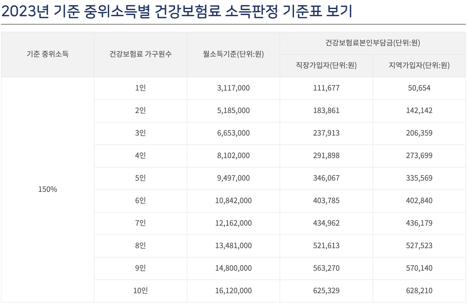 - 신청인이 속한 가구의 건강보험료 고지금액('23년 4월분)이 '23년 건강보험료 소득판정 기준표상 기준 중위소득 150%의 건강보험료 본인부담금 이하여야 함